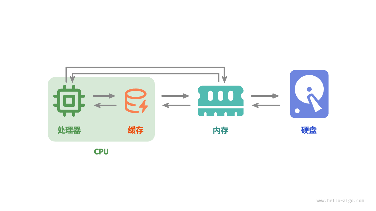 如图 4-10 所示,在程序运行时,数据会从硬盘中被读取到内存中,供 CPU 计算使用。缓存可以看作 CPU 的一部分,它通过智能地从内存加载数据,给 CPU 提供高速的数据读取,从而显著提升程序的执行效率,减少对较慢的内存的依赖。