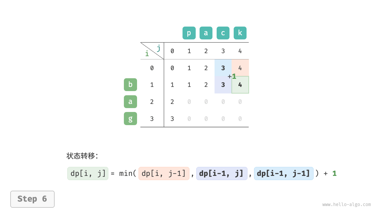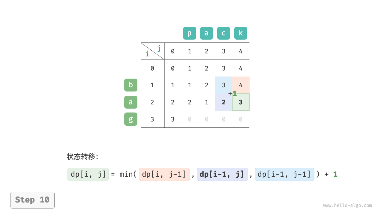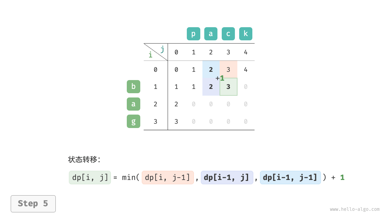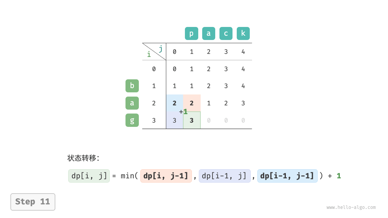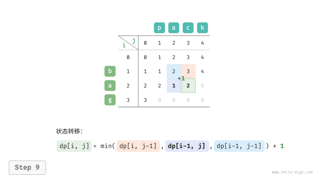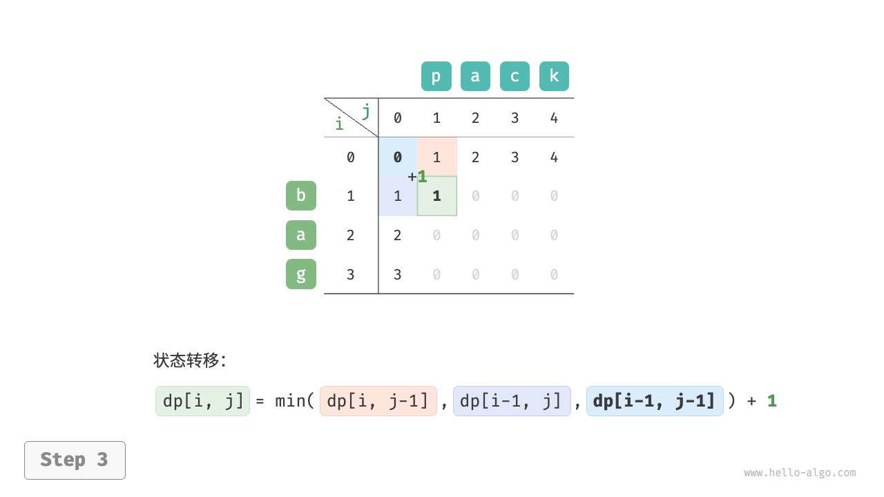 根据以上分析,可得最优子结构:\(dp[i, j]\) 的最少编辑步数等于 \(dp[i, j-1]\)、\(dp[i-1, j]\)、\(dp[i-1, j-1]\) 三者中的最少编辑步数,再加上本次的编辑步数 \(1\) 。对应的状态转移方程为: