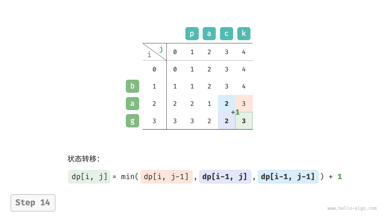 如图 14-30 所示,编辑距离问题的状态转移过程与背包问题非常类似,都可以看作填写一个二维网格的过程。