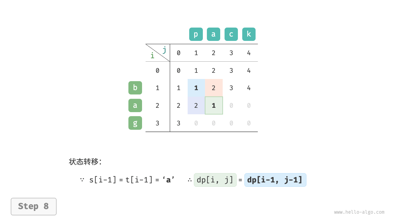- 若 \(s[n-1]\) 和 \(t[m-1]\) 相同,我们可以跳过它们,直接考虑 \(s[n-2]\) 和 \(t[m-2]\) 。