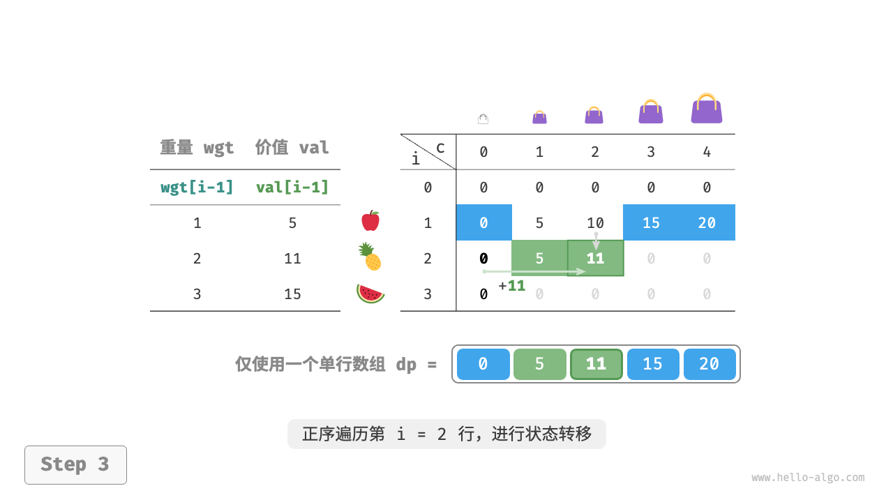 - 在完全背包问题中,每种物品的数量是无限的,因此将物品 \(i\) 放入背包后,仍可以从前 \(i\) 个物品中选择。