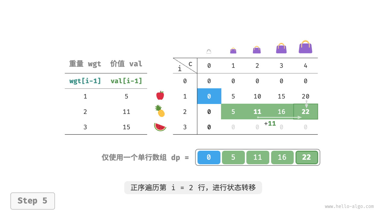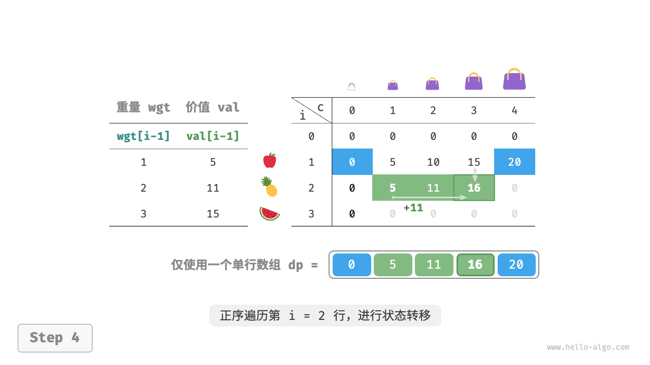 - 在 0-1 背包问题中,每种物品只有一个,因此将物品 \(i\) 放入背包后,只能从前 \(i-1\) 个物品中选择。